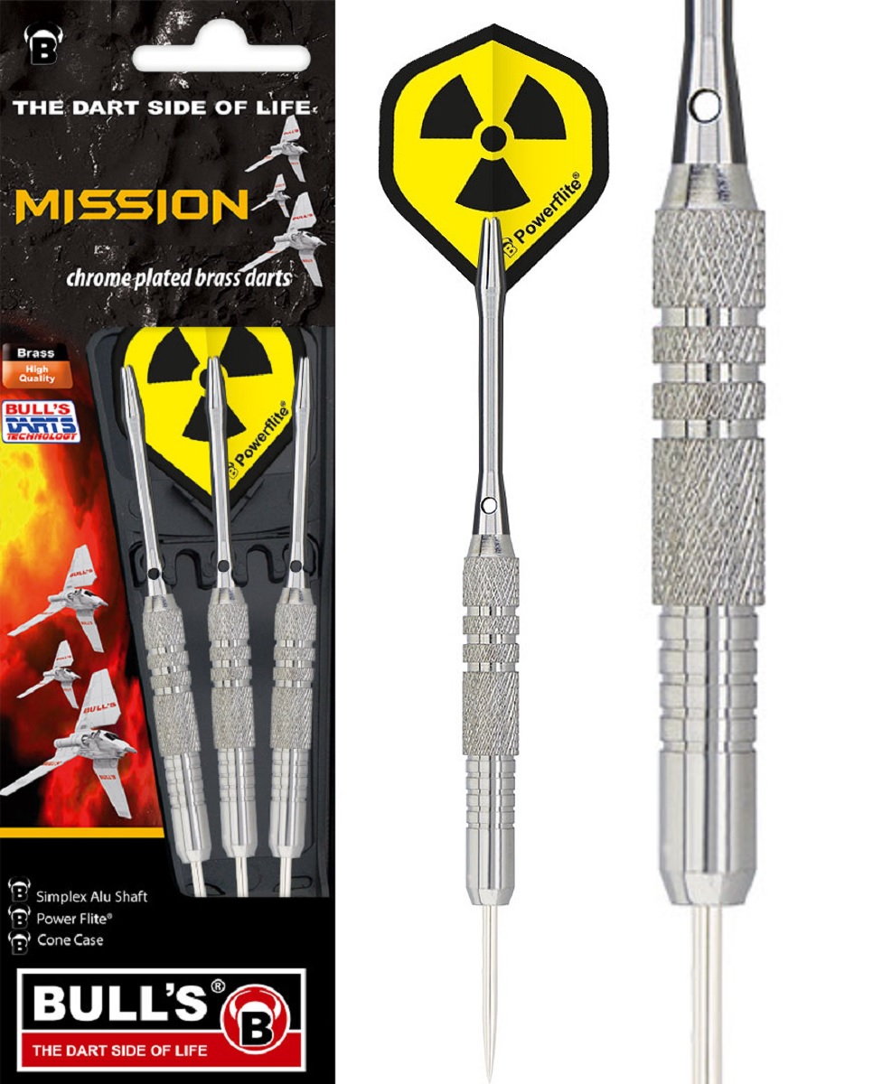 Bull's Mission Steel-Darts, Verchromter Brass Dart für den fortgeschrittenen Freizeitspieler in geringter oder gerändelter Ausführung. Mit Simplex Alu Schäften und Power Flite im handlichen Bull's Cone Case.