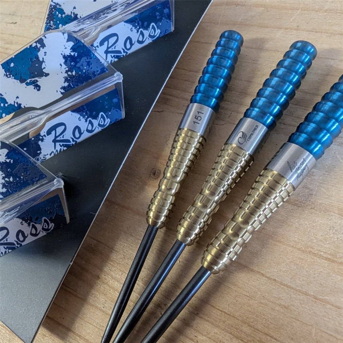 Cosmo Ross Montgomery Darts – Steeldarts – 90 % Tungsten – Limitierte Auflage – Blau & Gold – 24 g. Diese fachmännisch entwickelten Darts aus hochdichtem 90 % Wolfram bieten ein schlankes Profil für engere Gruppierungen und überlegene Kontrolle – ideal für ambitionierte Spieler, die ihre Präzision verbessern möchten. Das Barrel-Design zeichnet sich durch einen markanten blauen, breitringigen hinteren Barrel aus, der maximalen Komfort und einen gleichmäßigen Abwurf bietet. An der Vorderseite sorgt ein schmaler, konischer Abschnitt mit goldener Titanbeschichtung für ein elegantes Finish mit reduziertem Luftwiderstand und verbesserter Haltbarkeit. Diese Darts sind perfekt für Wettkampfspieler und Sammler und vereinen Stil, Innovation und die Empfehlung eines der Top-Profis des Sports.