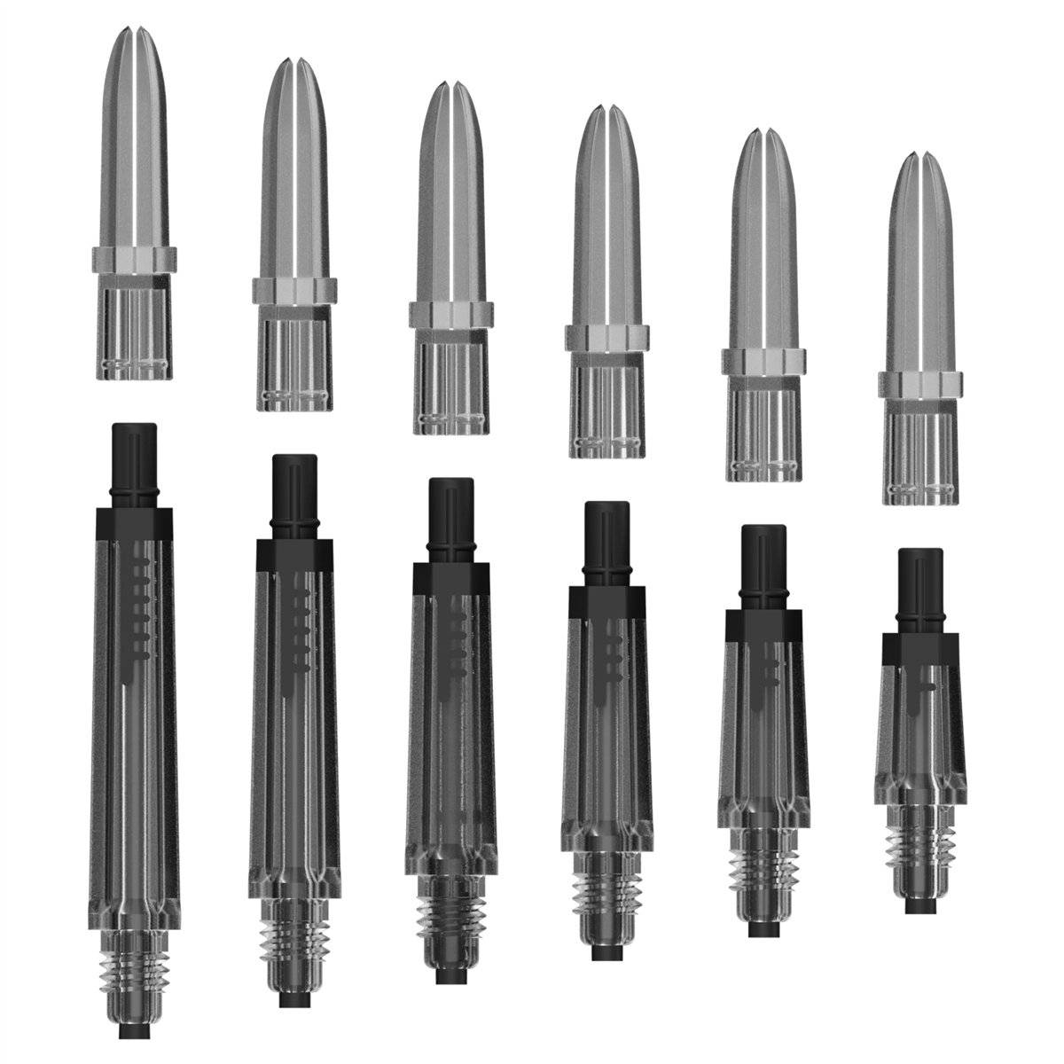 Die Shafts gibt es in sechs verschiedenen Längen. 19,28,22,31,25 und 35 mm. Gemessen jeweils Shaft-Anfang- Flight-Anfang.