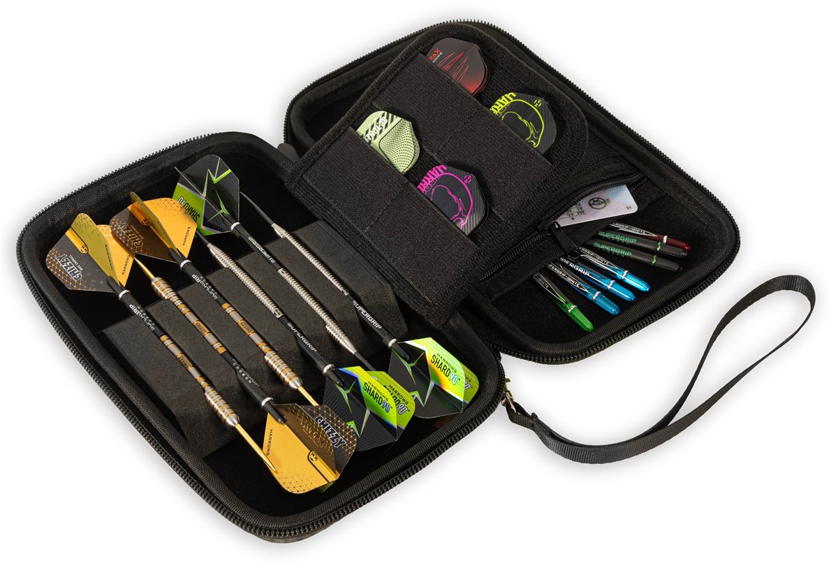 Kompakte Darttasche für 2 zusammengebautes Set Darts. Inkl. extra Fach für Dartzubehör wie z.B: Flights und Shafts.