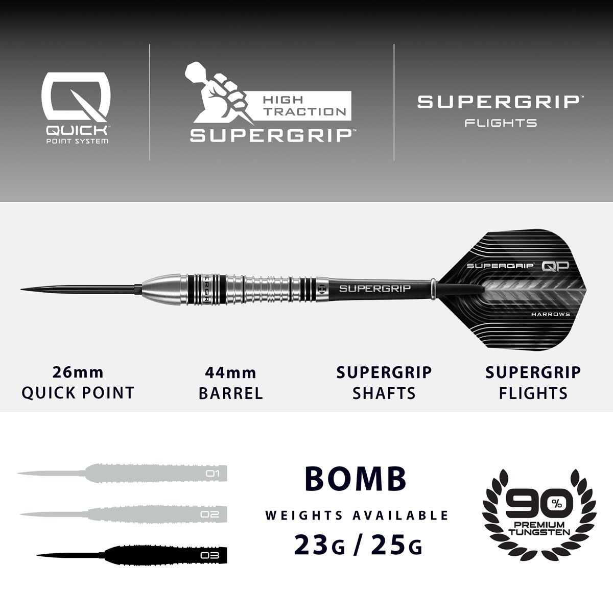Produktinformationen "Harrows Supergrip QP Bomb 90% Steeldarts 23/25 Gramm Steeldarts"