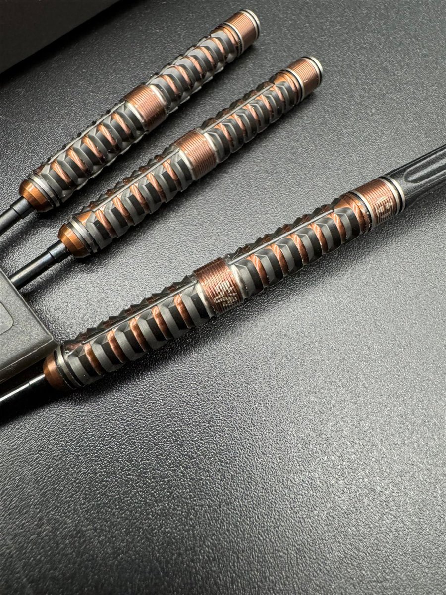 Optisch setzt der Wolfram Trinity QP mit seiner schwarz-kupferfarbenen Beschichtung ein kraftvolles Statement. Die hochwertige Titanium-Nitride-Beschichtung erhöht nicht nur die Haltbarkeit, sondern verleiht dem Dart auch eine edle, markante Optik.