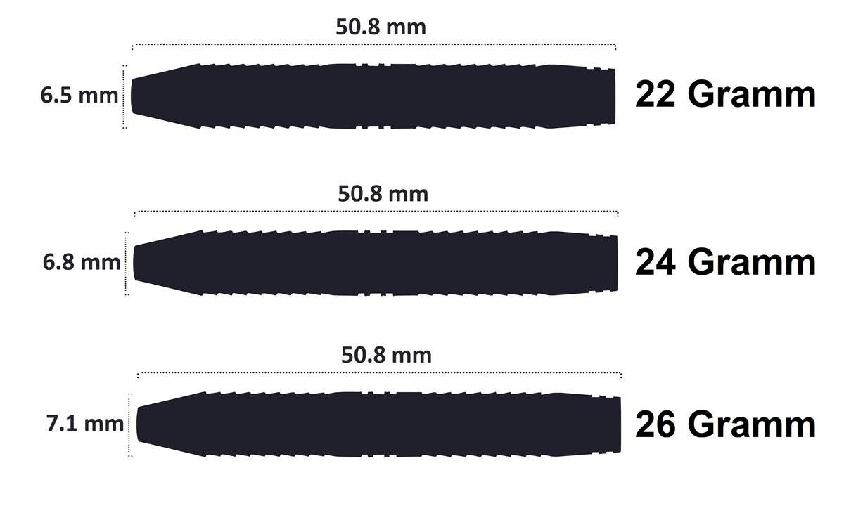 Der ZX-1 Dart hat einen 90% Tungsten Barrel mit tollem Grip und ist in 22,24 und 26 Gramm lieferbar. Das Gewicht ist auf 0,1 Gramm genau.