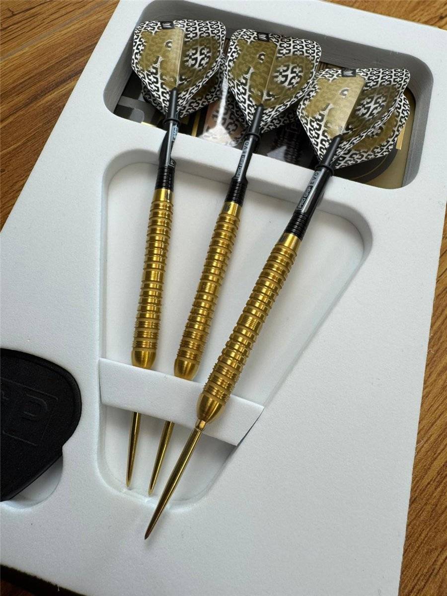 Das edle Gold-Finish unterstreicht die präzise Verarbeitung und verleiht den Darts eine stilvolle, hochwertige Präsenz am Board.