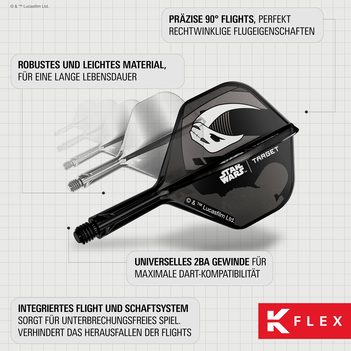 Das STAR WARS™ | TARGET Mandalorian K-Flex Integrated Flights & Shafts Multipack ist eine offizielle Zusammenarbeit mit The Walt Disney Company und kombiniert ikonisches Mandalorian-Design mit innovativer Dart-Technologie.
