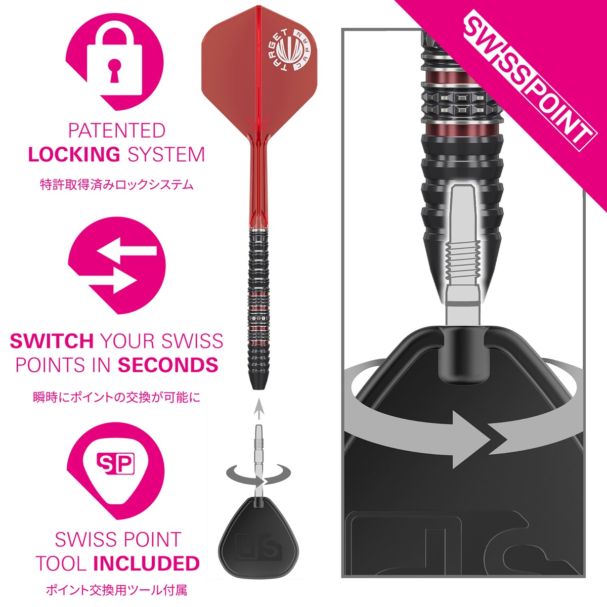 Was ist Swiss Point? Swiss Point ist ein patentiertes austauschbares Spitzensystem, mit dem man die Länge, den Stil und die Farbe der Spitze in Sekundenschnelle ändern kann. Das Swiss Point-Werkzeug im Taschenformat ist alles, was man zum Entfernen und Installieren der Spitze benötigt wird. Das patentierte Verriegelungssystem verwendet die Kegel- und Gewindetechnologie, um sicherzustellen, dass sich die Spitzen beim Spielen nicht lösen. Swiss Points verfügen über eine strategisch konstruierte Rille, die sicherstellt, dass gebrochene Spitzen mit dem Swiss Point-Werkzeug entfernt werden können. Swiss Points sind nur mit Target Darts SP-Barrel kompatibel
