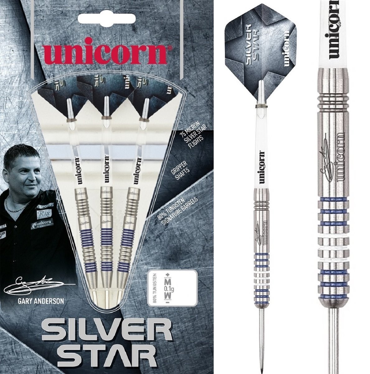 Unicorn Silver Star Gary Anderson. Gefertigt in hoher 80% Natural Tungsten Qualität. Die Barrels haben eine Gravur mit dem Unicorn Logo und der Unterschrift des Premier League Champions von 2011. Lieferung mit Gripper Schäften und im Compact Case.